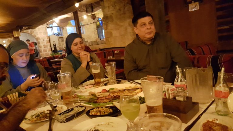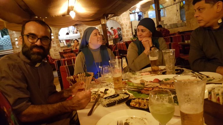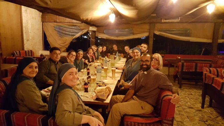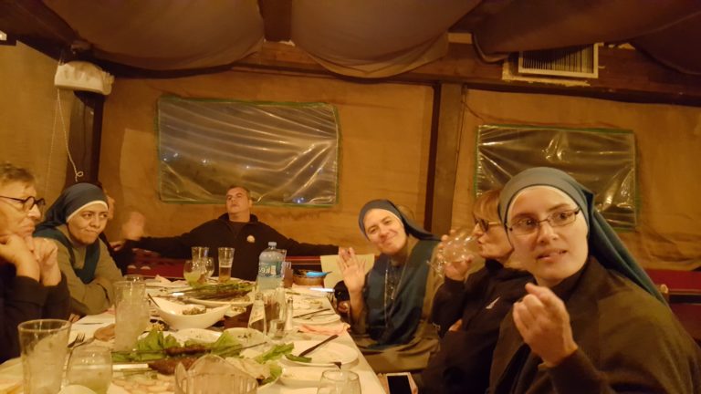 في نهاية هذا الشهر ، نظمت اخواتنا الراهبات بالتعاون مع مجموعة المتطوعين من Unitalsi (المنظمة التي تساعد بيت الطفل الالهي كثيرًا ، ماديًا وإرسال مجموعات من المتطوعين) حفل عشاء في مطعم تقليدي في بيت ساحور ، ثم قدموا للآب هدية ، كدليل على الامتنان لمساعدته لهم خلال هذا الشهر.