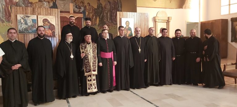مع وصول بطريرك الكنيسة الملكية (الروم الكاثوليك) ، اتجهنا جميعا الى كنيسة الروم الكاثوليك التي تبعد بضعة أمتار عن الدير. ومباشرة بعد استقبال البطريرك والكهنة شاركنا في صلاة الغروب في تلك الكنيسة.