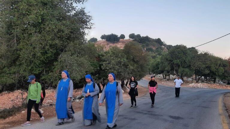 أثناء المسيرة ، تمت صلاة المسبحة الوردية وبعض التراتيل المريمية