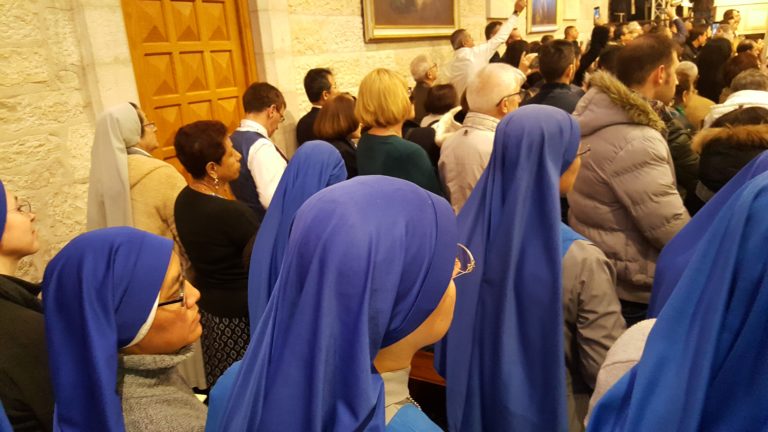 في المساء تناولنا العشاء في بيت الطفل الالهي مع جميع افراد عائلتنا الرهبانية المتواجدين في الارض المقدسة والمتطوعين الذين أرادوا مرة أخرى مشاركتنا في الاحتفالات بعيد الميلاد. لقد حظينا بنعمة المشاركة في القداس الالهي لليلة الميلاد في كنيسة المهد في بيت لحم ، حيث ترأس الاحتفال المدبر الرسولي للبطريركية اللاتينية ، بييرباتيستا بيتسابالا وشاركه الأساقفة بولس مركوتسوا وكمال بطحيش وعدد كبير من الكهنة منهم كهنة رهبنتنا: الاب كارلوس فيريرو الرئيس الاقليمي، والاب مارسيلو، نيستورـ جيسون و اندريس. أثناء الوعظ قال الأسقف بييرباتيستا: «يمكننا أن نقول إن عيد الميلاد هو اليوم الذي نحن مدعوون كي نسأل أنفسنا مرة أخرى عن المكان الذي نقف فيه – قال في العظة -: هل نسير مع الرعاة ، نبحث عن العمانوئيل ، الله معنا ، في حياتنا وفي العالم ، أم أننا أيضًا محبوسون في قصورنا؟ »