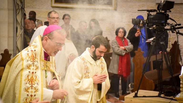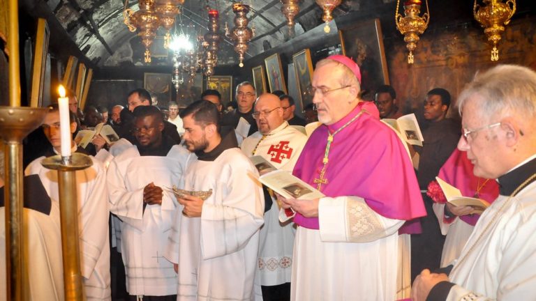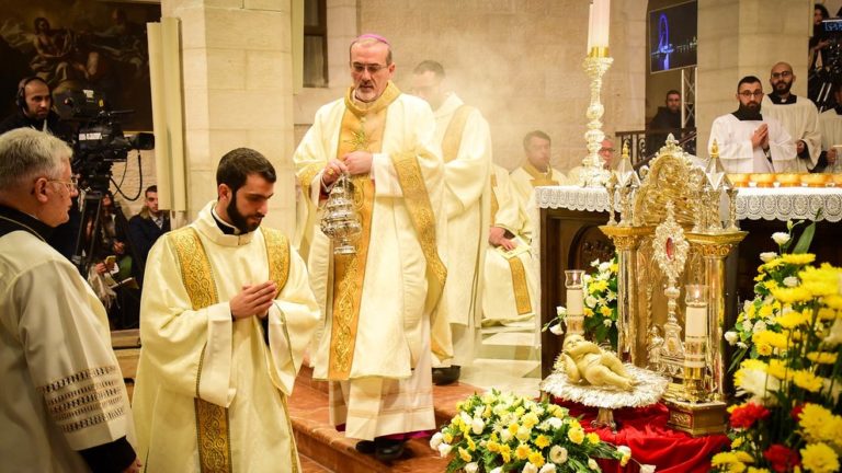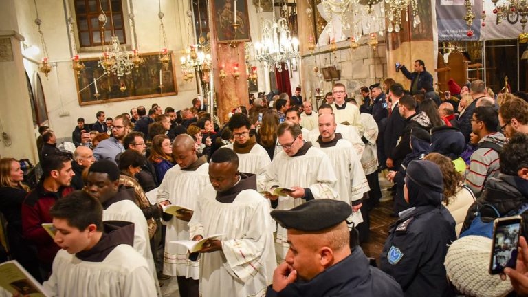 بدأ الاحتفال بصلاة الفرض الإلهي وانتهى بموكب الكهنة مع المدبر الرسولي الذي كان يحمل الطفل بين يديه نحو مغارة المهد ليترك الطفل يسوع في المذود ، حيث أصبح الكلمة جسدا قبل 2019 سنة في هذا المكان نفسه اتيا من اجل خلاصنا.