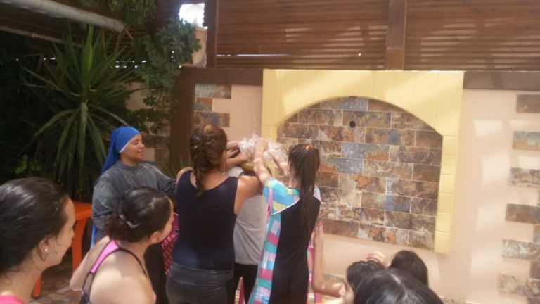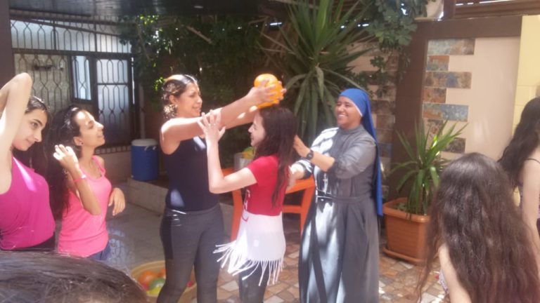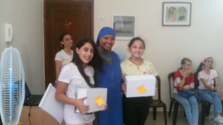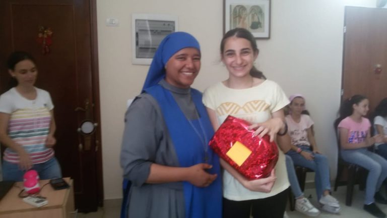 Las hermanas junto a los Padres organizaron un campamento para las chicas adolescentes en nuestra parroquia en Gaza. La jornada se dividía entre momentos de oración, peregrinaciones, juegos, competencias. Veinte chicas participaron en este campamento, donde el día se dividió entre los momentos de oraciones pidiendo la protección de nuestra Madre la Virgen María al comienzo del día y la Sant Misa, luego deportes físicos y visitas a áreas arqueológicas, juegos y competiciones. Por supuesto, el día termine con la oración del Rosario y la oración de la tarde, los campamentos no son solo para juegos y salidas, sino que también apuntan principalmente a la formación espiritual y al entrenamiento en la oración para acercarse a Dios y unirse más a Él.