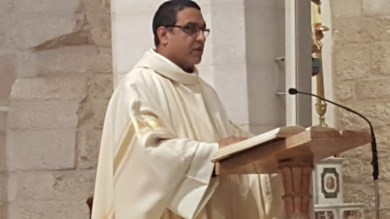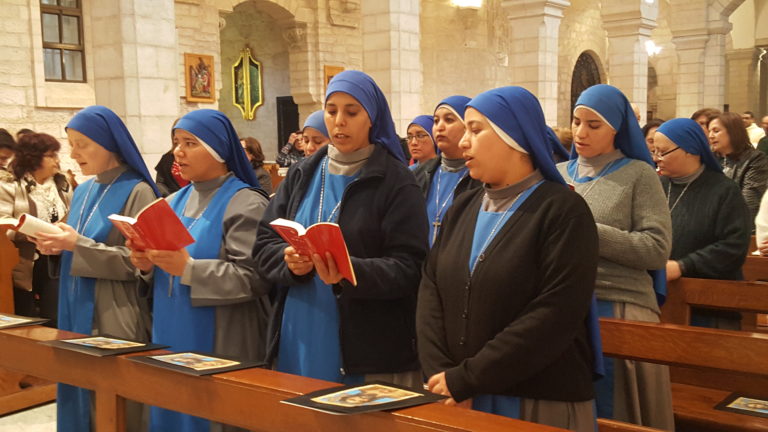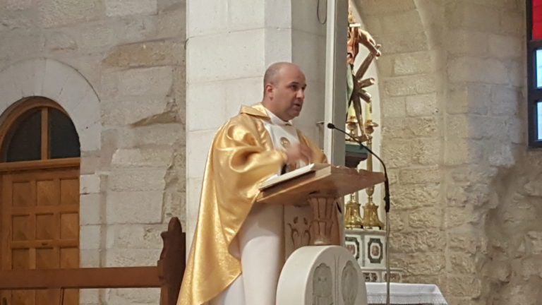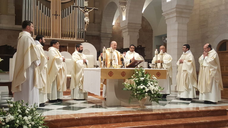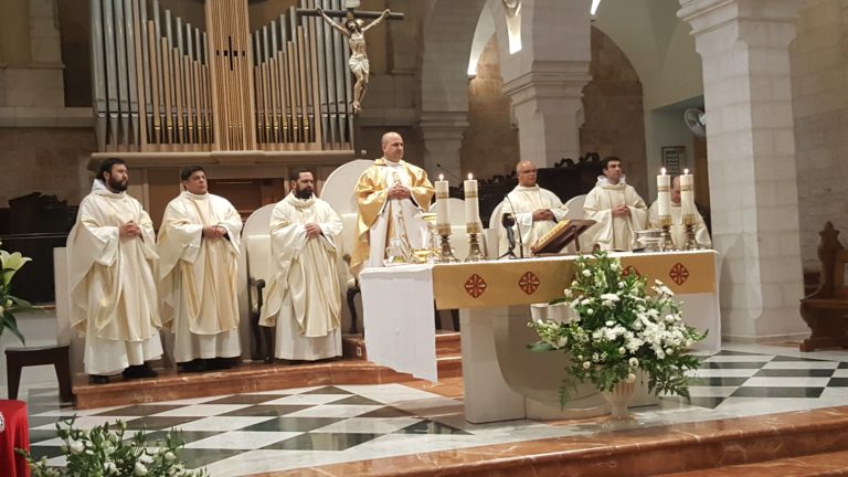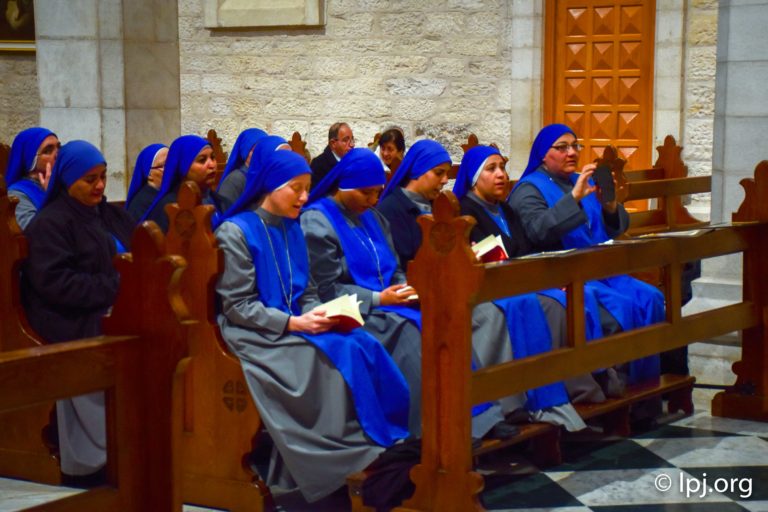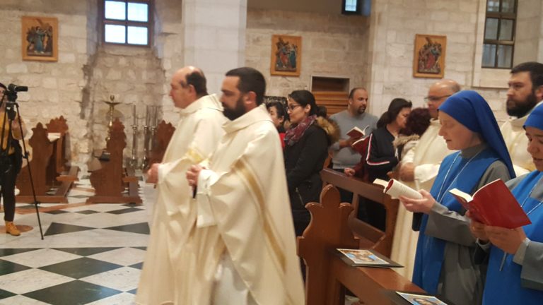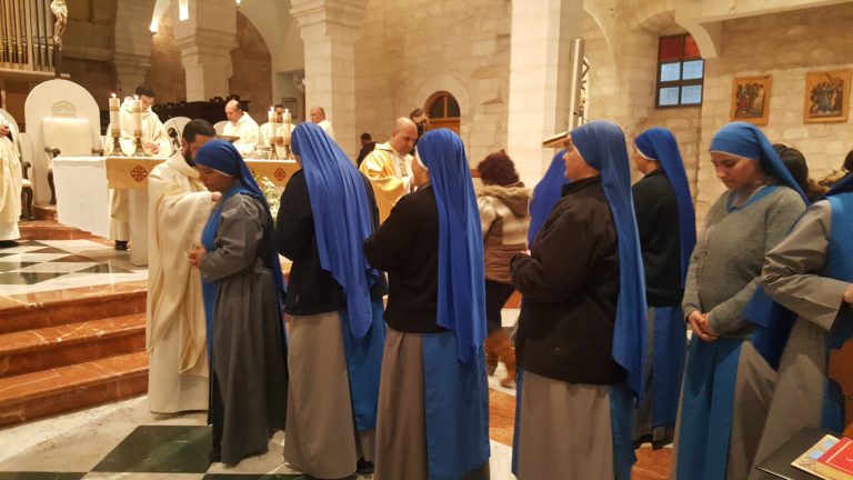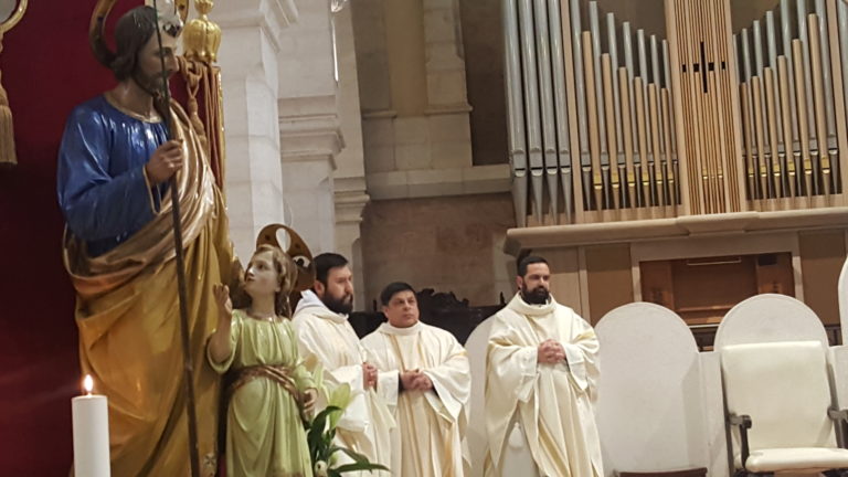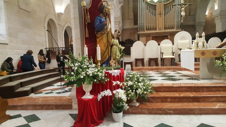 Hemos festejado este día junto a la parroquia de Belén, en la basílica de la Natividad, gracias al padre Rami Asakrieh, el párroco, que nos permitió celebrar esta fiesta con la comunidad parroquial, contento de poder celebrar juntos a san José, hijo de esta tierra de Belén. La iglesia estaba muy linda, adornada para la ocasión, especialmente la estatua de san José. Durante la Santa Misa las hermanas renovamos nuestros votos y al terminar hicimos una procesión con la reliquia de la silla de san José (¿recorriendo la iglesia y el claustro?). La Misa fue presidida por el padre Rami y celebraron con él nuestros Padres IVE y Monjes; asistimos las hermanas, miembros de la tercera orden, amigos, bienhechores y fieles de la parroquia, todos disfrutaron de la celebración y, especialmente de la procesión, por la gran veneración que hay en esta tierra hacia san José.
