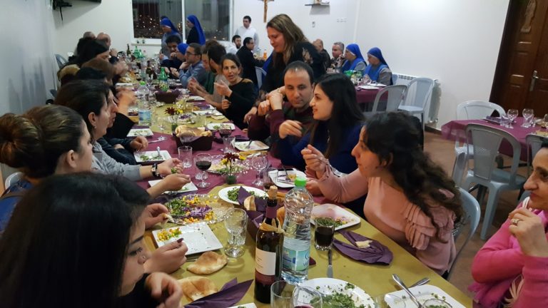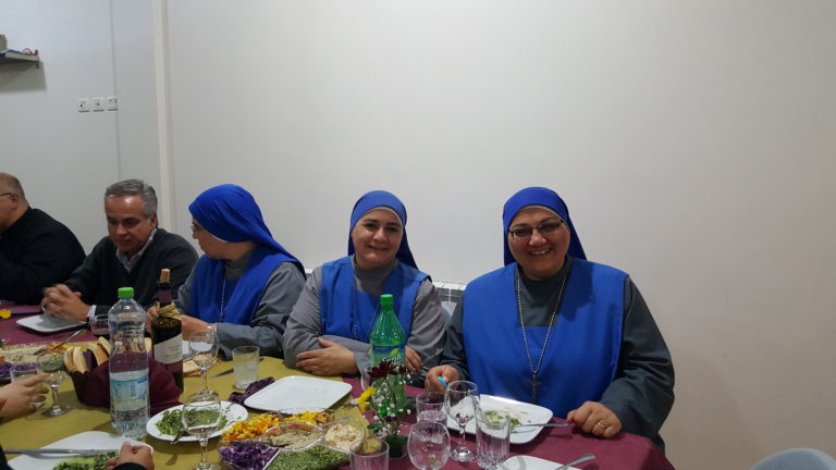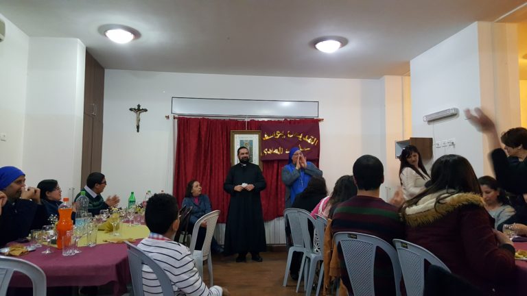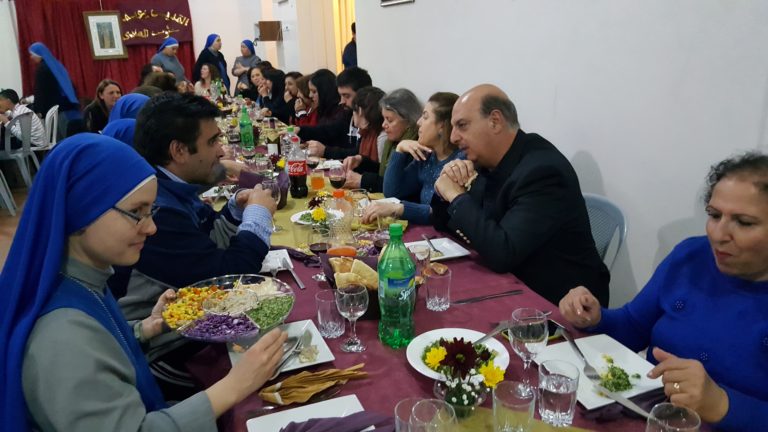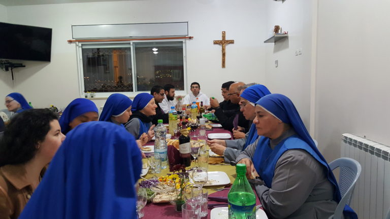 Después de la Santa Misa ofrecimos a los asistentes un pequeño refrigerio, con café y dulces; luego las hermanas y los padres continuamos la celebración en el Hogar con la tercera orden, algunos de nuestros amigos, los trabajadores y algunos de los chicos del Hogar, tuvimos una cena festiva incluido el tradicional fogón, con cantos a san José en árabe y en español; terminamos con un canto en árabe a la Virgen. Los chicos del Hogar estaban felices y empezaron a festejar y bailar incluso antes de la cena, mostrando a su manera su cariño a san José.