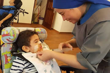 - Amar a Dios manifestándolo en el amor concreto a los hermanos, ya que es el único medio posible de amar a Dios, según nos enseñó Jesucristo. Afirma el apóstol: «quien dice que ama a Dios y no ama a sus hermanos, es un mentiroso» (cf. 1 Jn 4,20). Queremos así seguir las huellas del Verbo Encarnado, que viniendo a redimirnos del pecado, se compadeció aun de las heridas que este causó en nosotros, dado que pasó por este mundo sanando a los hombres de sus miserias físicas y espirituales, con lo cual dio prueba fehaciente de su misericordia y de su amor al Padre. Resumiendo lo que debe ser nuestro espíritu en la práctica de las obras de misericordia llamadas “corporales”, recordamos la exhortación de la Beata Madre Teresa de Calcuta: «no estamos aquí por el trabajo. Estamos por Jesús. Ante todo somos religiosos. No asistentes sociales, maestros, enfermeros, médicos. Servimos a Jesús en los pobres y todo esto que hacemos es por Él. Nuestra vida no tiene otro sentido. Ésta es una cosa que muchos no comprenden. Servimos a Jesús veinticuatro horas al día y Él nos da fuerzas. Lo amamos en los pobres y a los pobres con Él, pero siempre primero al Señor». Algunas e las obras de misericordia de nuestra familia religiosa son: