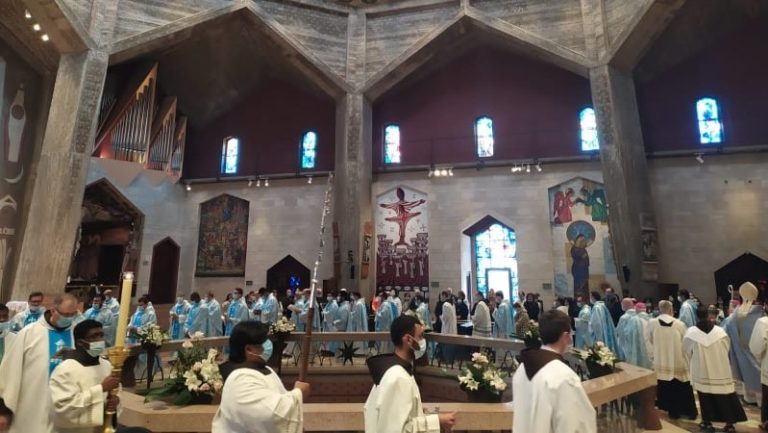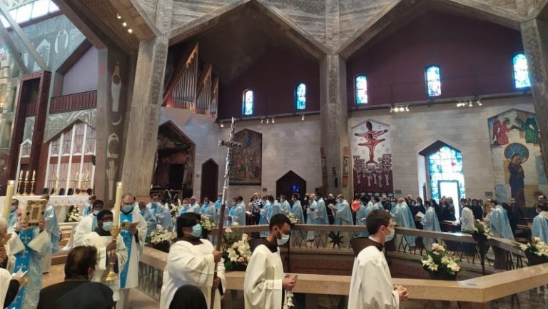 Al día siguiente, partimos temprano hacia la Basílica de la Anunciación, en Nazaret, donde luego de rezar ante la gruta que fue testigo de la visita del ángel Gabriel a nuestra madre del Cielo, participamos de la santa Misa presidida por el Patriarca, Monseñor Pierbattista Pizzaballa, con gran número de sacerdotes concelebrantes y fieles que no querían desaprovechar esta oportunidad tan especial de conmemorar la Encarnación del Señor en el lugar preciso en que ésta aconteciera.