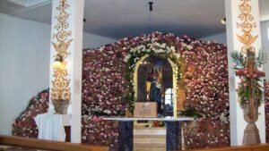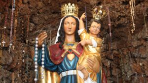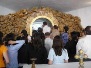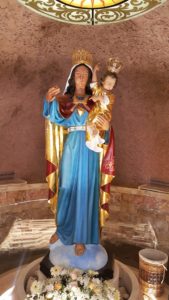 داخل المزار هناك مغارة تحتوي على تمثال لمريم العذراء يحمل الطفل يسوع، محمية بباب من زجاج مُغلق بثلاثة أقفال. ومفاتيح الاقفال تُحفظ عادتا في بيت الكهنة.