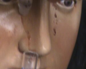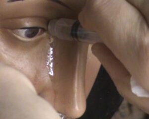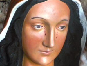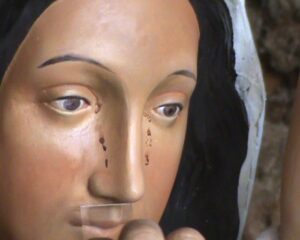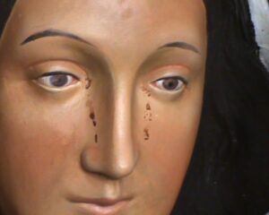 بعدة عدة دقائق، بينما كانت الراهبة قريبة جدا من المغارة وامام تمثال العذراء بالظبط يفصلها عنه الزجاج، رأت وجه العذراء تحول الى وجه طبيعي وبدأت بالرمش (تحريك رموش العيون). في هذه اللحظة خافت الراهبة وصرخت، مُلفتة انتباه الحاضرين. وعند اقترابهم رأوا رموش العذراء تتحرك و سقطت دمعتين حمراء من عيون العذراء.